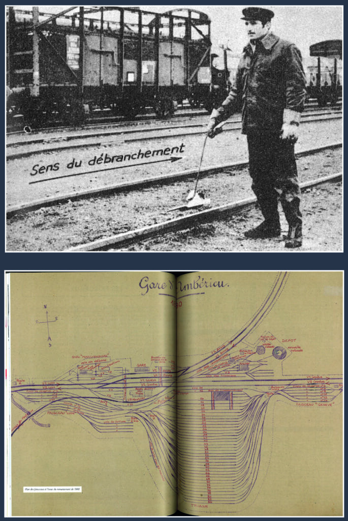 Les enrayeurs travaillaient sur la gare de triage dont l’impressionnant réseau de faisceaux a valu à Ambérieu le nom « d’étoile ferroviaire » se distinguant ainsi parmi les plus importantes gares de triage de l’époque.