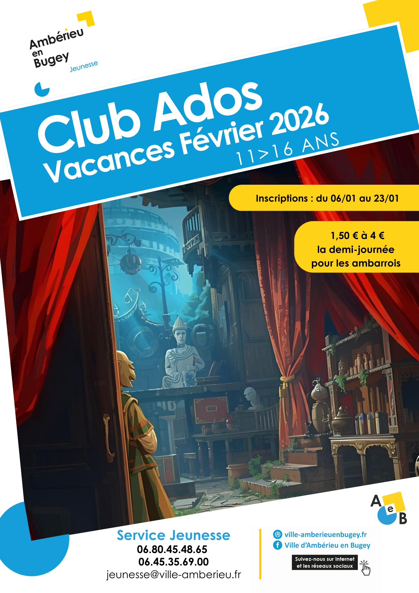 Tu as entre 11 et 16 ans ? Viens nous rejoindre au Club Ados pendant les vacances de février 2026 ! Au programme : l’Envers du décor Semaine du 9 février : studio de doublage, sortie LaserGame/trampoline, initiation manga… Semaine du 16 février : journée aux plans d’hotonnes, Archery Game, soirée Casino…. Accueil en journée […]
