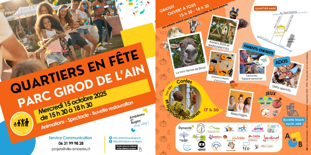 Maintenant bien connus des Ambarrois, les Quartiers en Fête invitent tous les habitants pour 3 h d’animations et 1 spectacle d’art vivant dans des écrins de verdure de la Ville :